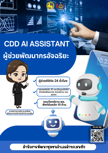 CDD AI คือ เว็บไซต์และแพลตฟอร์มผู้ช่วยพัฒนากรที่ใช้เทคโนโลยีปัญญาประดิษฐ์ (AI) รวบรวมข้อมูล เครื่องมือ และสารสนเทศสำคัญด้านการพัฒนาชุมชนไว้ในที่เดียว ช่วยให้พัฒนากรืผู้บริหารและประชาชนเข้าถึงข้อมูลที่จำเป็นได้ง่ายขึ้น พร้อมสามารถวิเคราะห์สถานการณ์ชุมชน วางแผนการพัฒนาได้อย่างรวดเร็ว แม่นยำ และมีประสิทธิภาพ