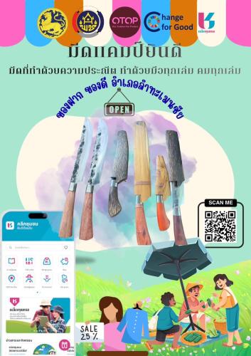 คือกลุ่มOTOP มีดแคมป์ยินดี เป็นมีดที่ตีด้วยมือทุกเล่ม คม อายุการใช้รายงานงานได้นานหลายปี ใส่ใจการผลิตทุกขั้นตอน