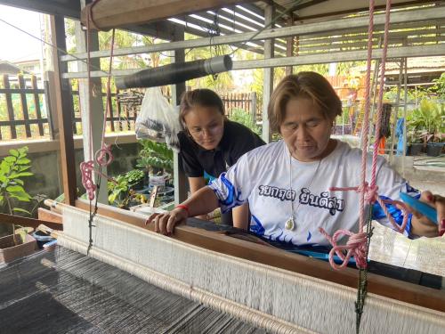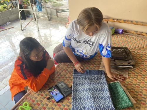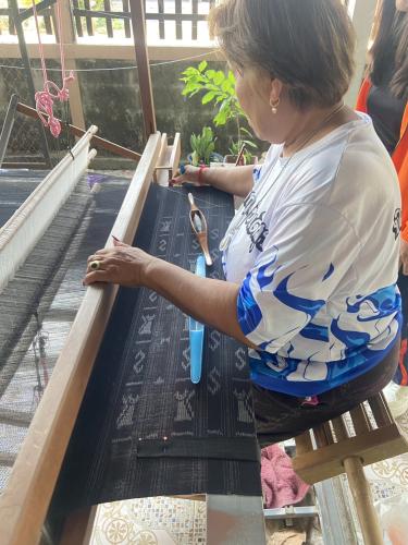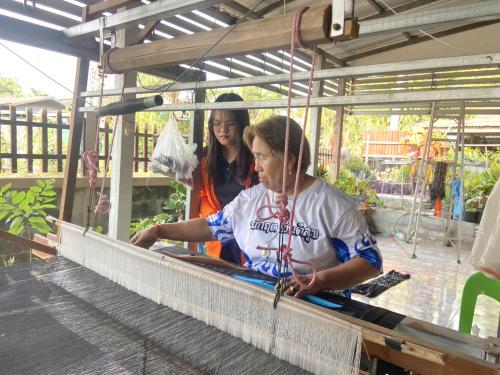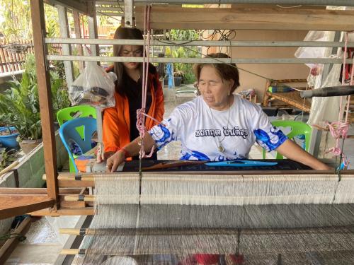 ในการนี้ประธานกลุ่มฯ ได้มีการทอผ้าซึ่งเป็นการทอลายผ้าที่มีการประยุกต์และผสมผสานลายกันเพื่อให้ได้ลวดลายที่ตัวลง ไม่ว่าจะเป็นการมัดหมี่เพื่อให้เป็นลายแมว(แมวโคราช) ผสมกับลายขอพระราชทานฯ และยังมีการผสมผสานด้วยลายหางกระรอก บ่งบอกให้เห็นถึงความตั้งใจและการมีศักยภาพของกลุ่มผู้ประกอบการOTOP
